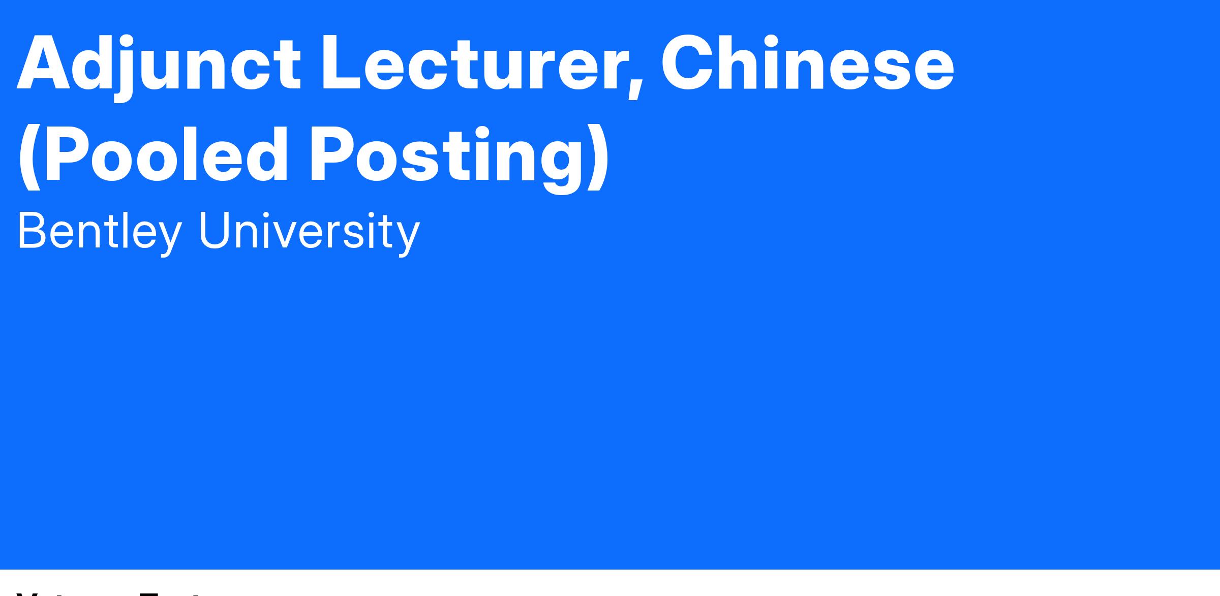 The Modern Languages Department at Bentley University is accepting applications to build a pool of instructors for possible future part-time Adjunct Lecturer, Chinese assignments. The department chairperson will review applications as vacancies become available.Primary Responsibilities: