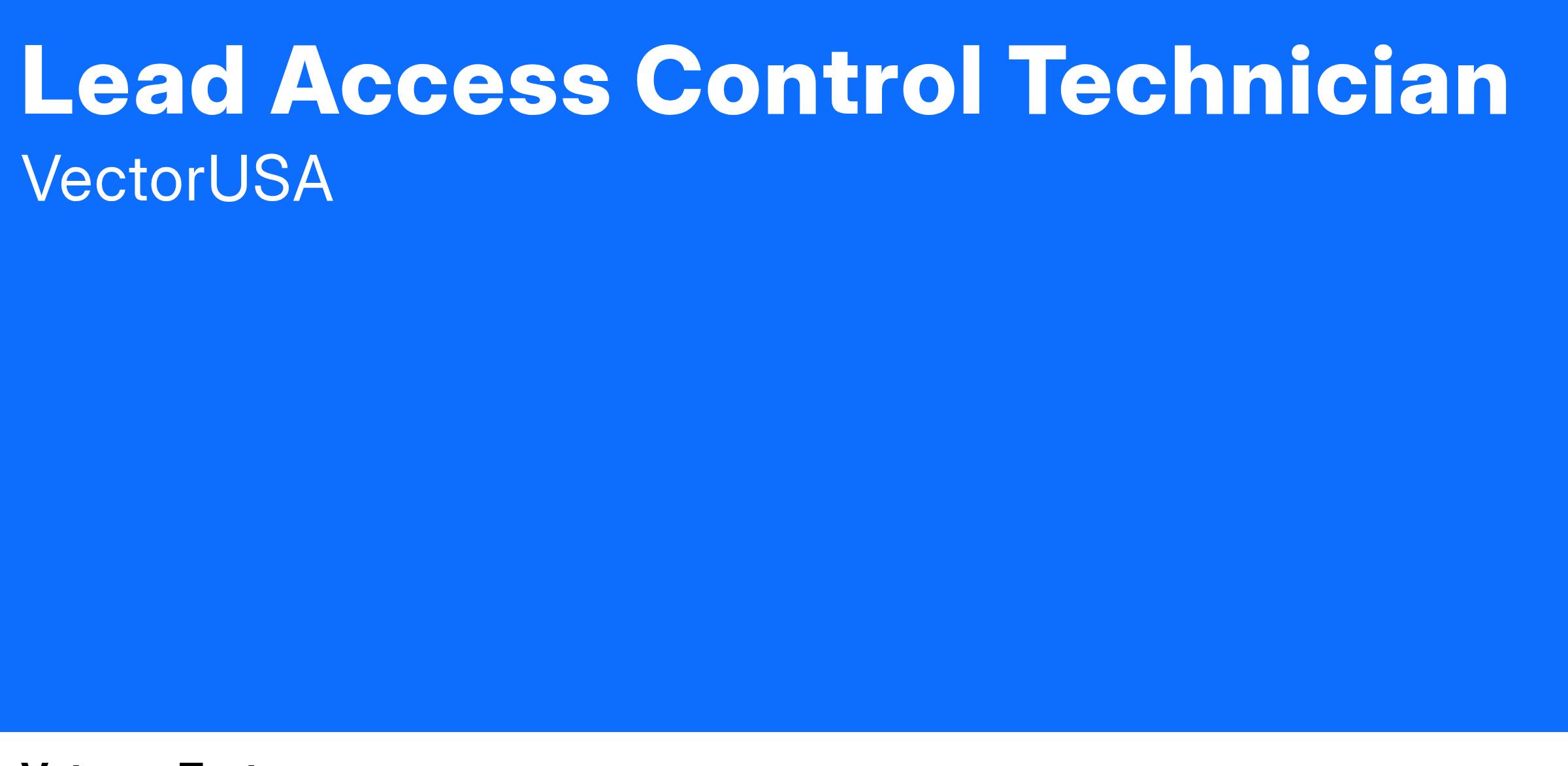 VectorUSA is looking for a Lead Access Control Technician with 3-5 years experience with installing and programming access control systems. The position will be responsible for installing and servicing enterprise level access control systems, integrated locksets, intercoms, visitor management systems, and video management systems.