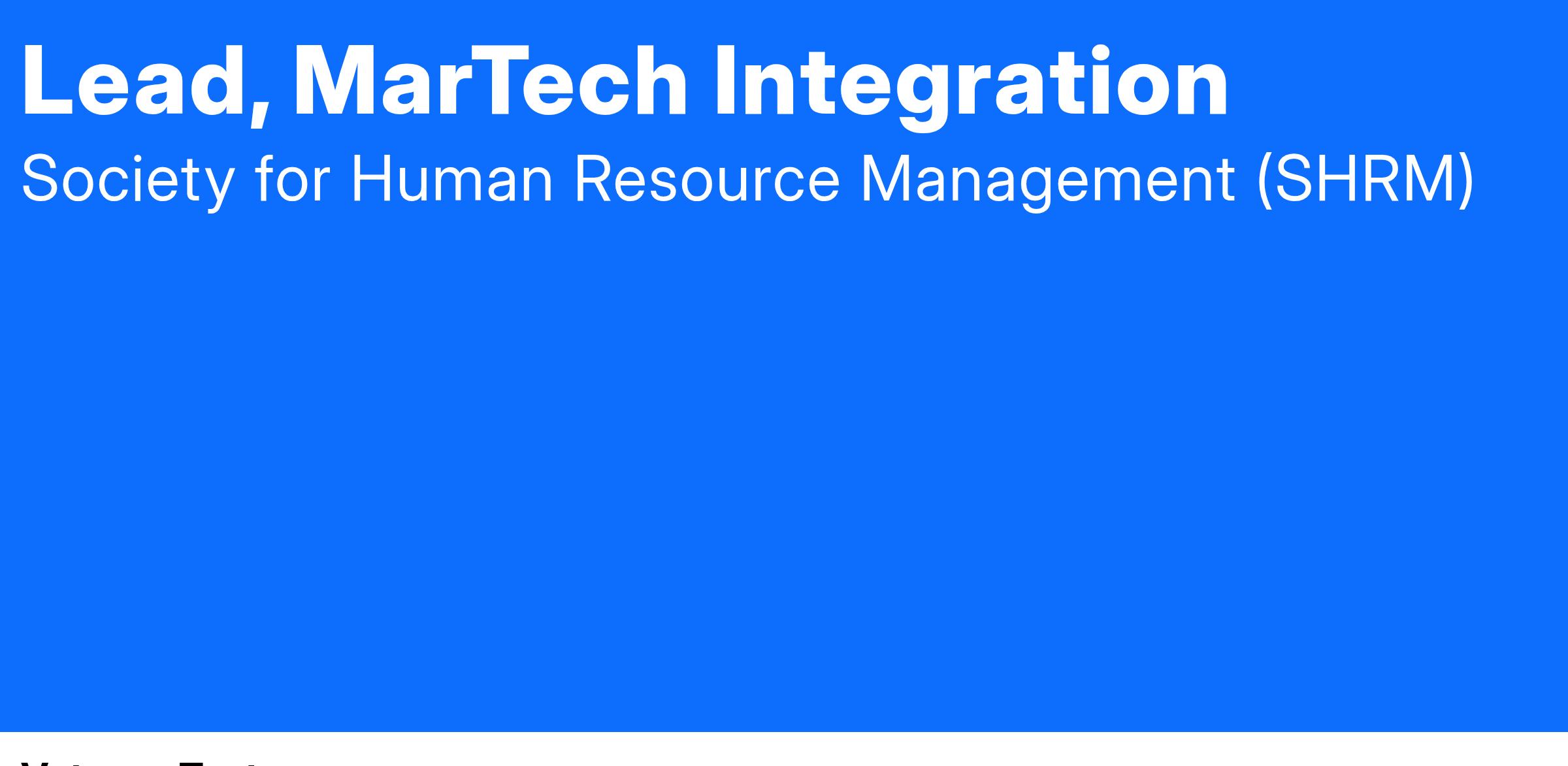 The Lead, MarTech Integration is responsible for developing, maintaining, and optimizing SHRM’s marketing technology framework to drive efficiency, personalization, and ROI across all product lines. This role will ensure seamless integrations across digital marketing platforms, enhance automation and campaign management, and lead cross-functional collaboration with IT, Business Intelligence, and Marketing teams.