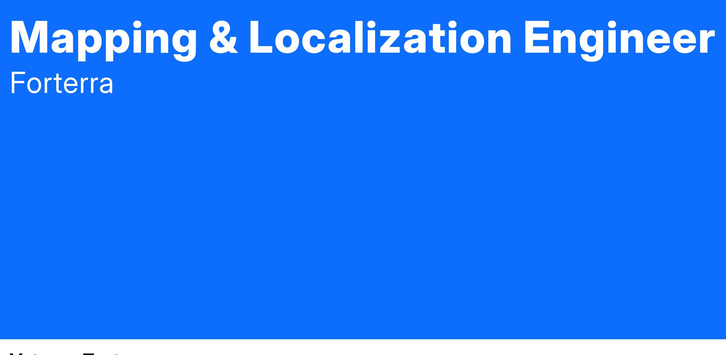 - Forterra is seeking a Mapping and Localization Engineer to join our team in developing robust and innovative localization systems for autonomous systems. The ideal candidate has a strong software development background coupled with experience developing and optimizing algorithms for precise localization and mapping in dynamic environments.