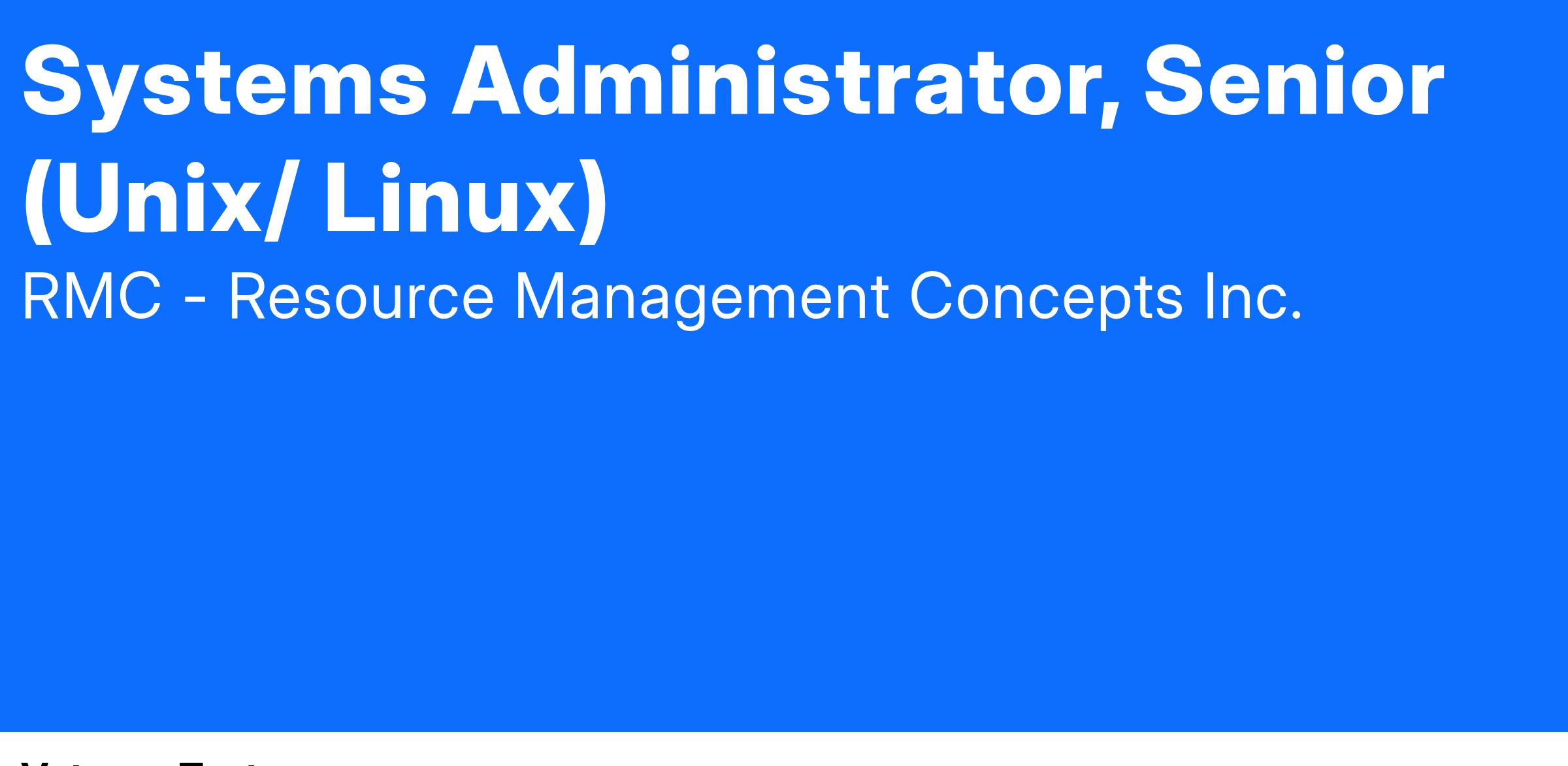 Description: RMC is hiring for a Senior Unix/Linux Systems Administrator to support a Department of the Navy (DoN) customer in Dahlgren, VA. Position is contingent of successful award of contract. Resource Management Concepts, Inc. (RMC) provides high-quality, professional services to government and commercial sectors. Our mission is to deliver exceptional management and technology solutions supporting the protection and preservation of the people and environment of the United States of America. RMC is hiring for a Senior Unix/Linux Systems Administrator who will provide support to an RDT&E environment. The selected applicant will manage the functionality and efficiency of a group of windows workstations and servers and perform hardware and software installations.
